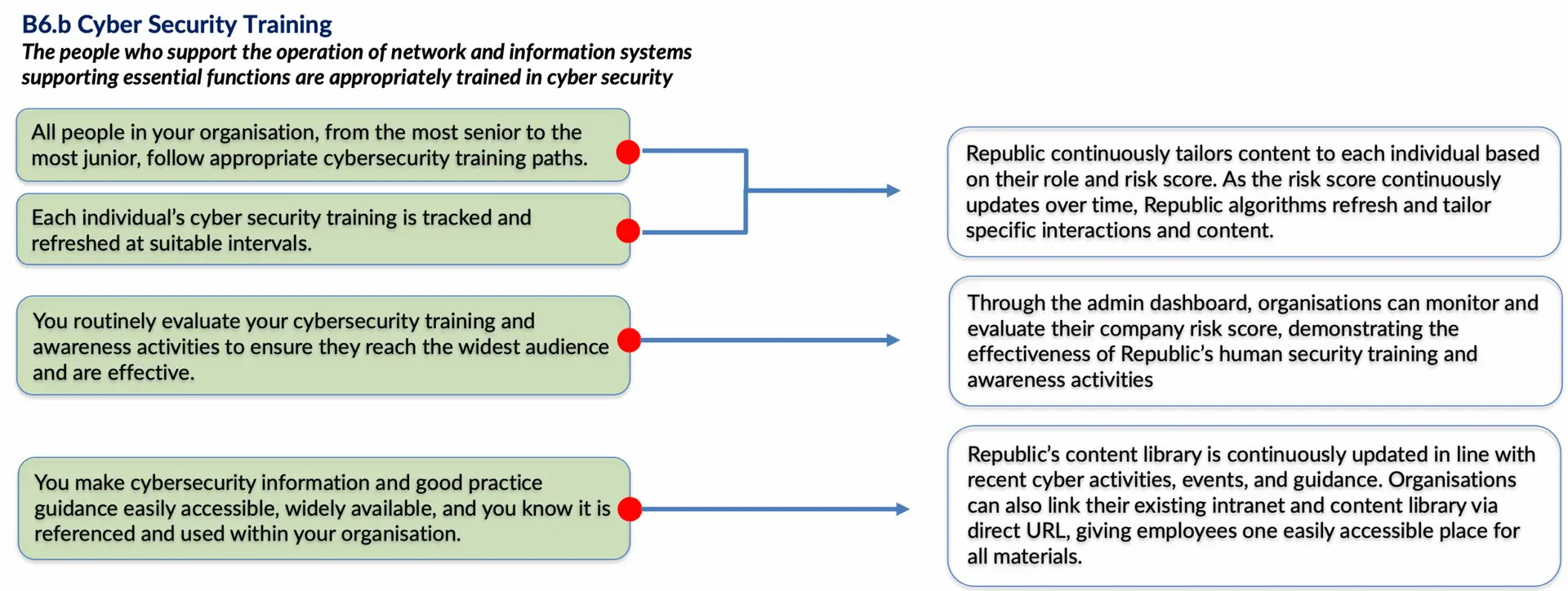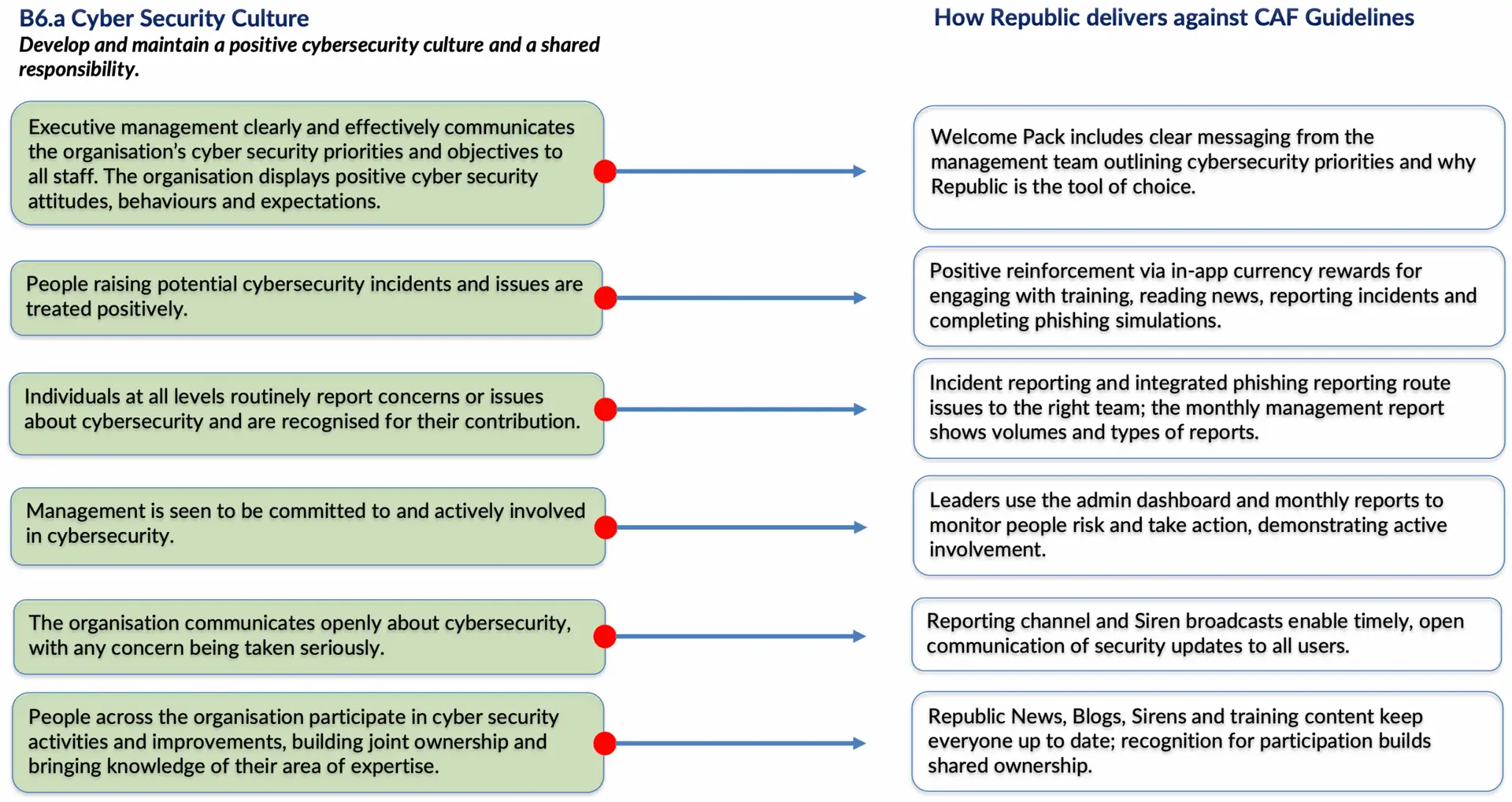 Republic operationalises CAF 4.0 by providing the human-layer tools, analytics, and culture-building mechanisms needed to demonstrate maturity in cyber awareness, governance, and resilience. It bridges the gap between policy and practice, ensuring organisations can evidence alignment with CAF outcomes while continuously improving their people’s cyber behaviours. To organise a demo or start a free trial see https://www.recyber.com/getting-started/.